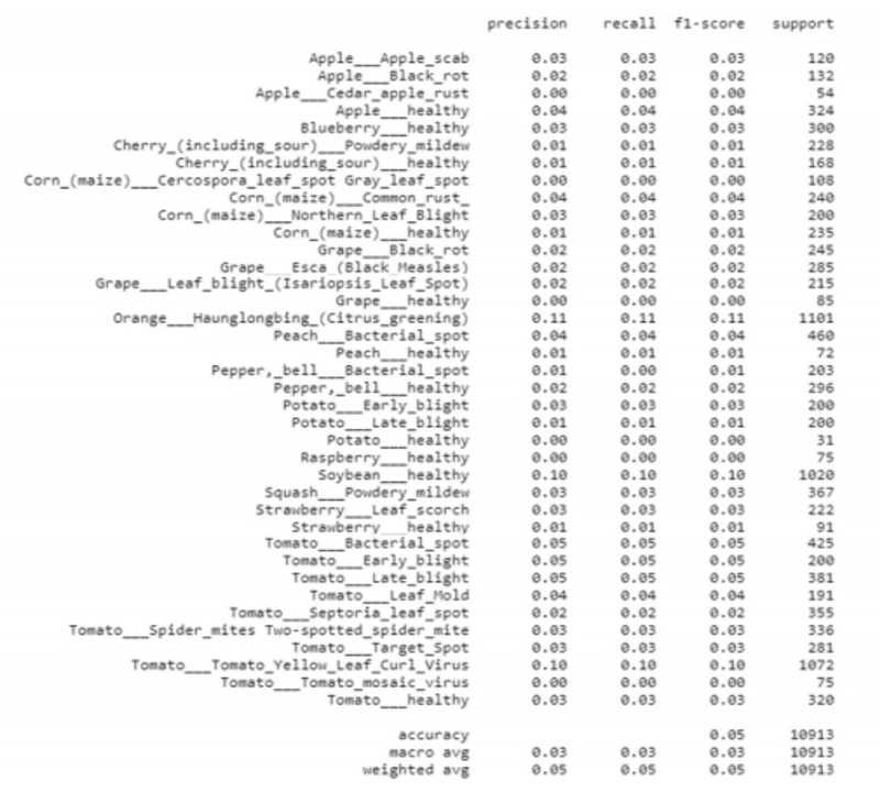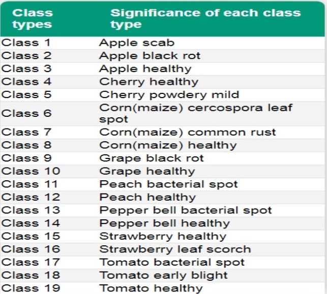 The matrix below shows which class of crop/ disease the picture taken resembles and has highest probability with respect to the picture uploaded. In this case the position 1 is of highest probability and hence resembles class one disease. The matrix position with the highest probability represents the class of leaf (image uploaded by the farmer). Hence, this is used to say whether that particular crop is diseased or not.